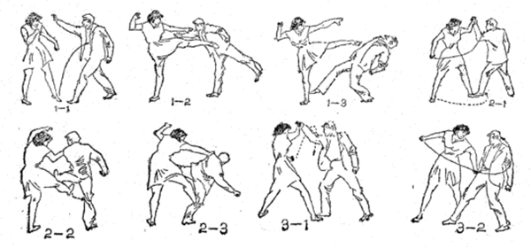 若流氓分子迎面扑来,欲抓握我身体某部分(图1一1),待他伸出的手将触及我身体的瞬间,我突然向后跃退一小步(这一步必须根据对方前冲的速度而定。一般以退到他刚抓不到我的那一点最佳),略微向后仰身,前脚借落地之势,点地即起,对准其心窝或腹裆部位狠踹(图1一2、图1--8)。因为我这一踹腿发出的方向恰好和他前冲的方向相反,其胸腹部所承受的击打力等于二力之和,故其创必重。