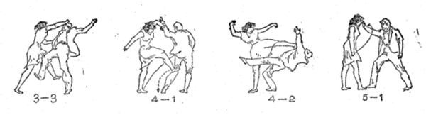 流氓仲右手欲抓我肩胸部(图5一1),我则待其手将到之时突然向左拧身,使来手落空。同时屈双肘,由内向外反格其手臂。这样一来可作自己防护,二来可为击打流氓作好准备(图5一2)所示。