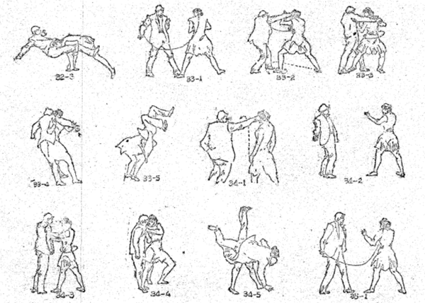 夹住对方颈部,身体向左前下方猛转,头部向左扭转,将敌 重重摔倒。如图35一4所示。