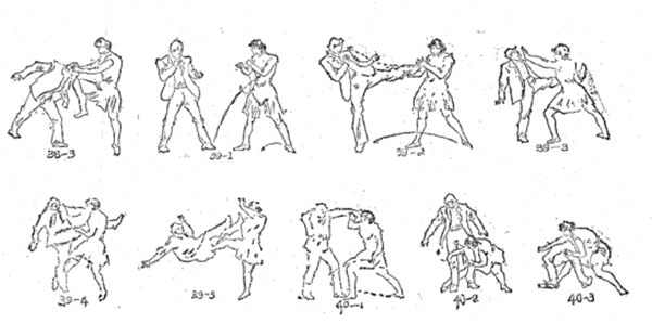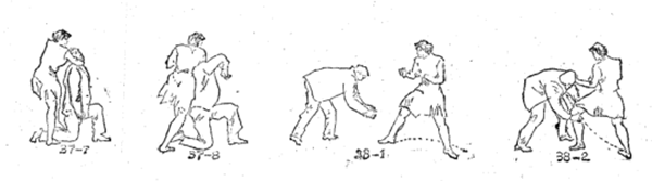 敌右擅拳击面,我拾左臂反隔。如图35-2。左手反腕搭住对方小臂内侧;右脚扣上一步,身体左后转,以臀部顶住对方右髋部,同时右背前你,夹住敌人朝部。如图36-8所示。