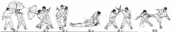 制敌效果:伞截扫臂可破敌匕首攻击,掏腿后扯,敌身体失去重心必然倒地。
