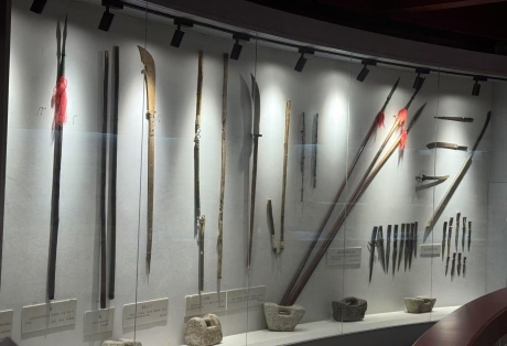 沿着参观路线缓缓前行,展示柜中陈列着许多与八极拳相关的珍贵文物。一本本古老的拳谱,纸张已经泛黄,却被保存得十分完好。翻开拳谱,上面用毛笔工整地记录着八极拳的招式、心法和练习方法,字迹刚劲有力,仿佛能看到先辈们在灯下潜心钻研武术的身影。这些拳谱不仅是八极拳技艺传承的重要载体,更是先辈们智慧的结晶。在一旁的展示架上,摆放着一些武术器械,如八极刀、八极枪等。八极刀刀身宽厚,刀刃锋利,闪烁着寒光;八极枪长枪笔直,枪缨飘扬,威风凛凛。讲解员详细介绍道:“八极枪是八极拳器械中的代表,它枪法独特,讲究‘一寸长一寸强’,在实战中变化多端,威力巨大。这把八极枪可是有着悠久的历史,曾经见证过许多精彩的武术对决”。
