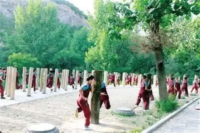 在通往少林永智武校的山沟中,几十个学员在树桩中左冲右杀,把树桩打得啪啪作响,他们正在练“铜臂铁腿”。释永智介绍说,这是传统少林功夫的习练方法,旨在恢复少林功夫原生态,展现出传统少林功夫独特魅力。